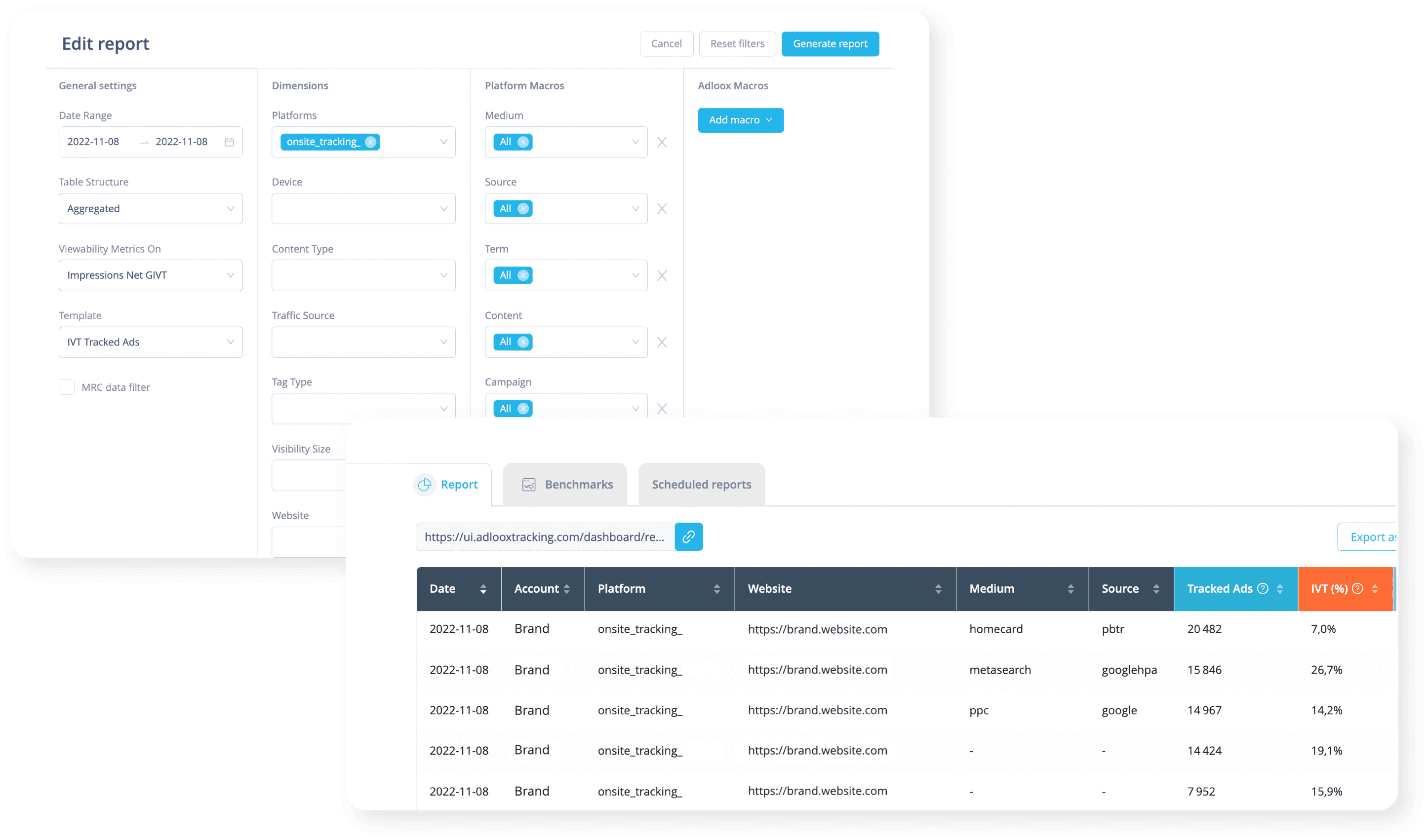 Adloox offers full reporting capabilities thanks to it’s unique dashboard. All the data will be available by source, by UTM, aggregated or log level for more transparency and better activation.
